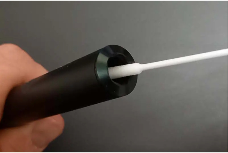 將棉花棒插入棍棒的開口處,將其靠在棍棒的側面,然後輕地、緩慢地從後面垂直地向開口處描率.