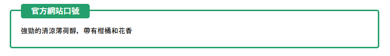 這款品的整體特點注重口味,含有濃烈的薄荷醇,能帶來烈的提神效果,帶有淡淡的柑橘和薰衣草香味.