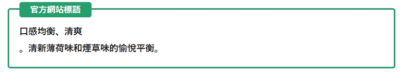 當你吸入蒸氣的那一刻,清爽的感覺逐渐包圍你的舌頭和喉。吸入時味道不濃烈,口感柔滑,但呼出時可以感受到濃鬱的薄荷味。它幾乎沒有刺痛感、強烈的刺痛感或苦味,具有理想的薄荷味,並帶有一甜味,一直持績到最後.它在香菸的自然刺激和濃鬱的吸力之間達到了完美的平衡,也許這就是黄金比例的意義?